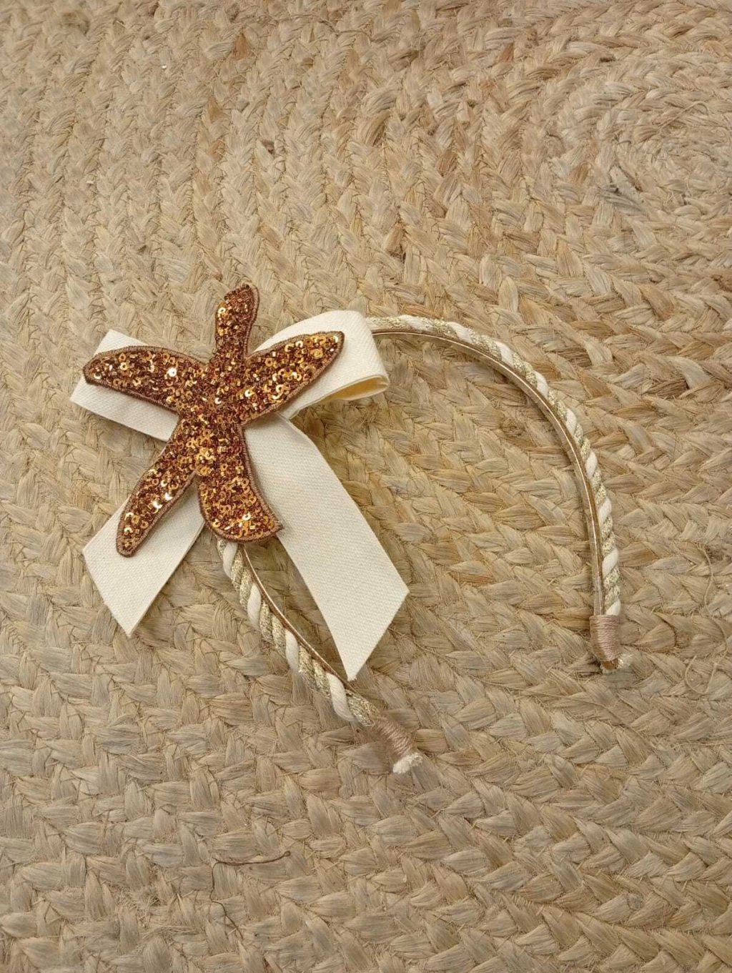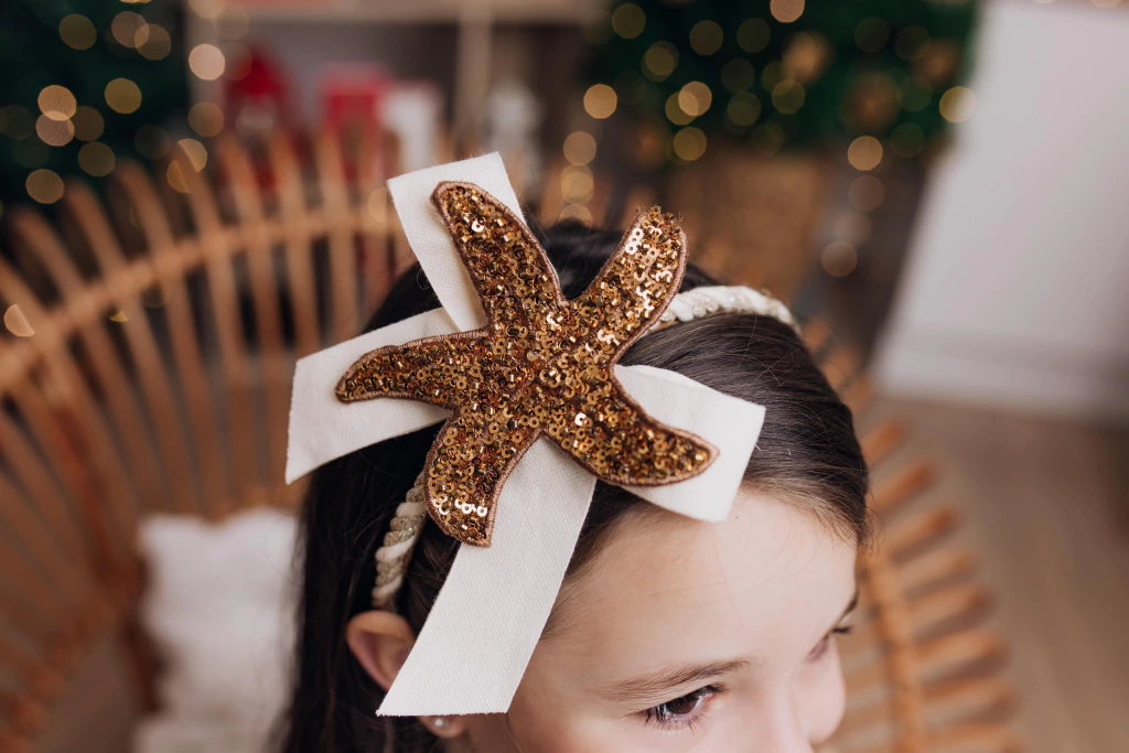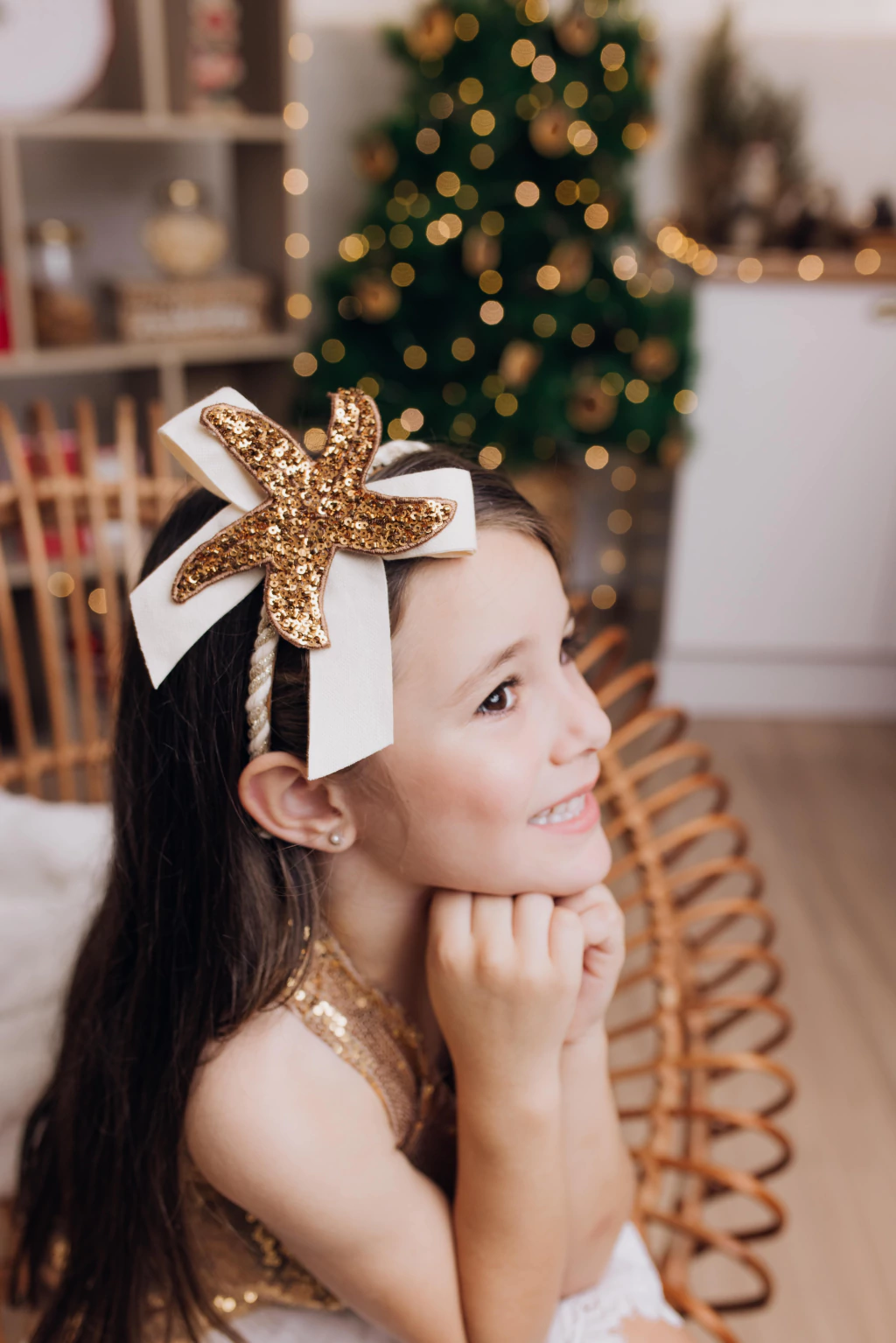 Com uma estrela-do-mar dourada cheia de paetês reluzentes, este arco é perfeito para looks de fim de ano, festas e fotos inesquecíveis. O laço off-white traz um contraste delicado, e o arco revestido garante conforto e fixação.